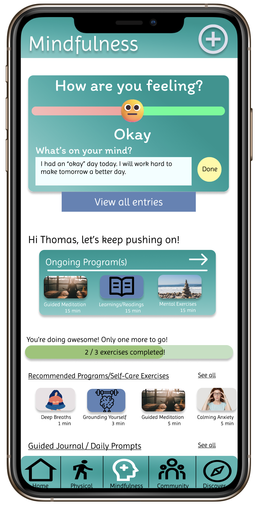 The app seems to be generally straightforward to use; Click on the Physical page for physical activity, Mindfulness page for Mental Health exercises, Community page for social interactions, and Discover page for finding new things to learn.