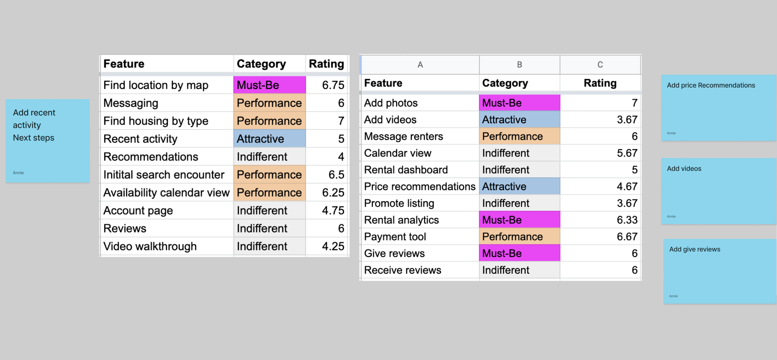 Towards the end of this Discovery and Research phase, a Kano Analysis was conducted to reveal what features the users themselves deemed valuable and important within a home-rental platform.