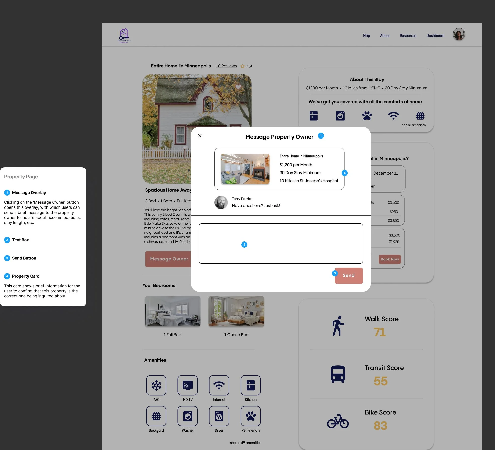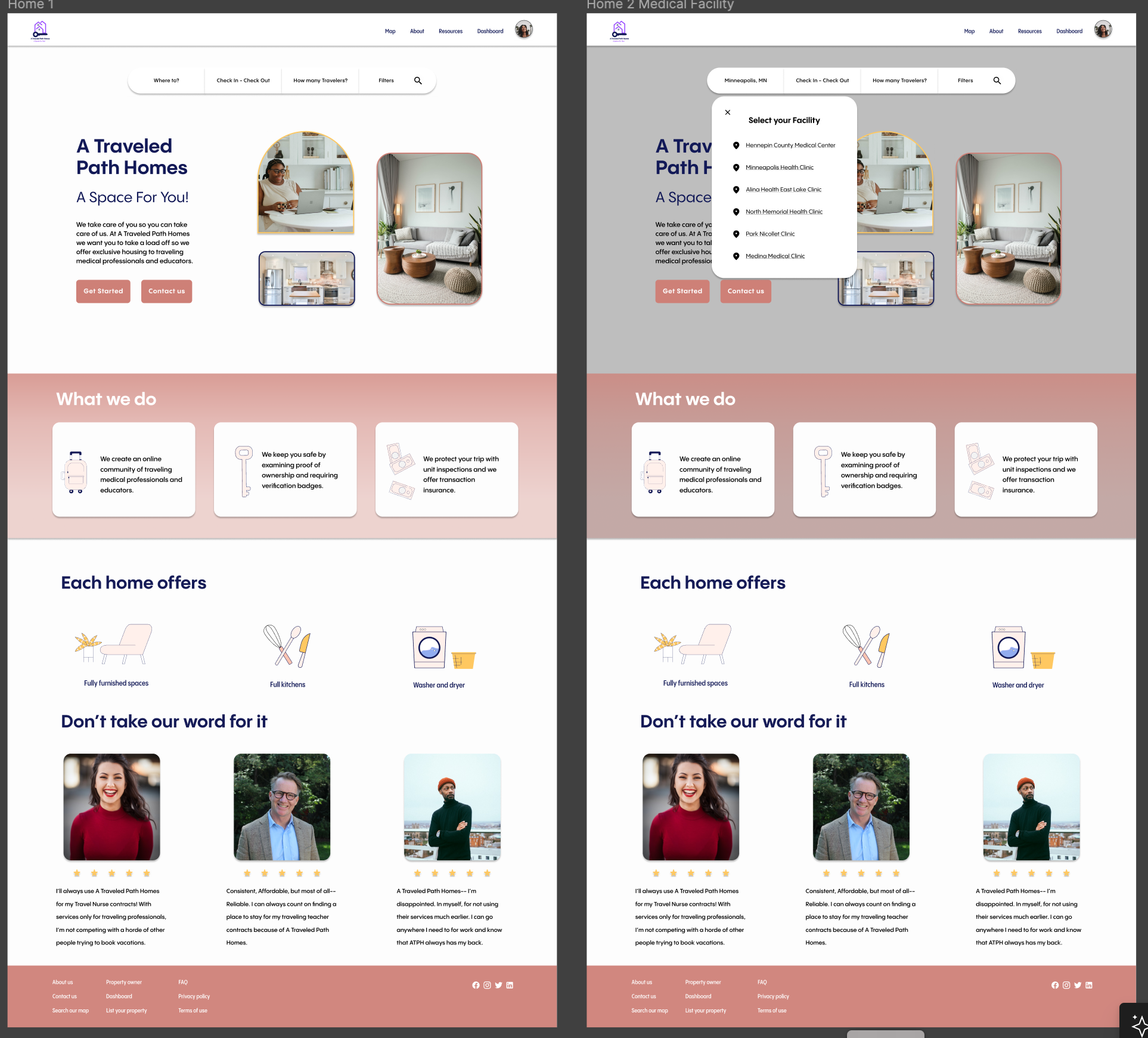 With these findings as our fuel, we designed an interactive booking platform specifically catered to their primary users- traveling professionals looking to rent and property owners, with which A Traveled Path can use to aid in securing funding and begin providing their service.