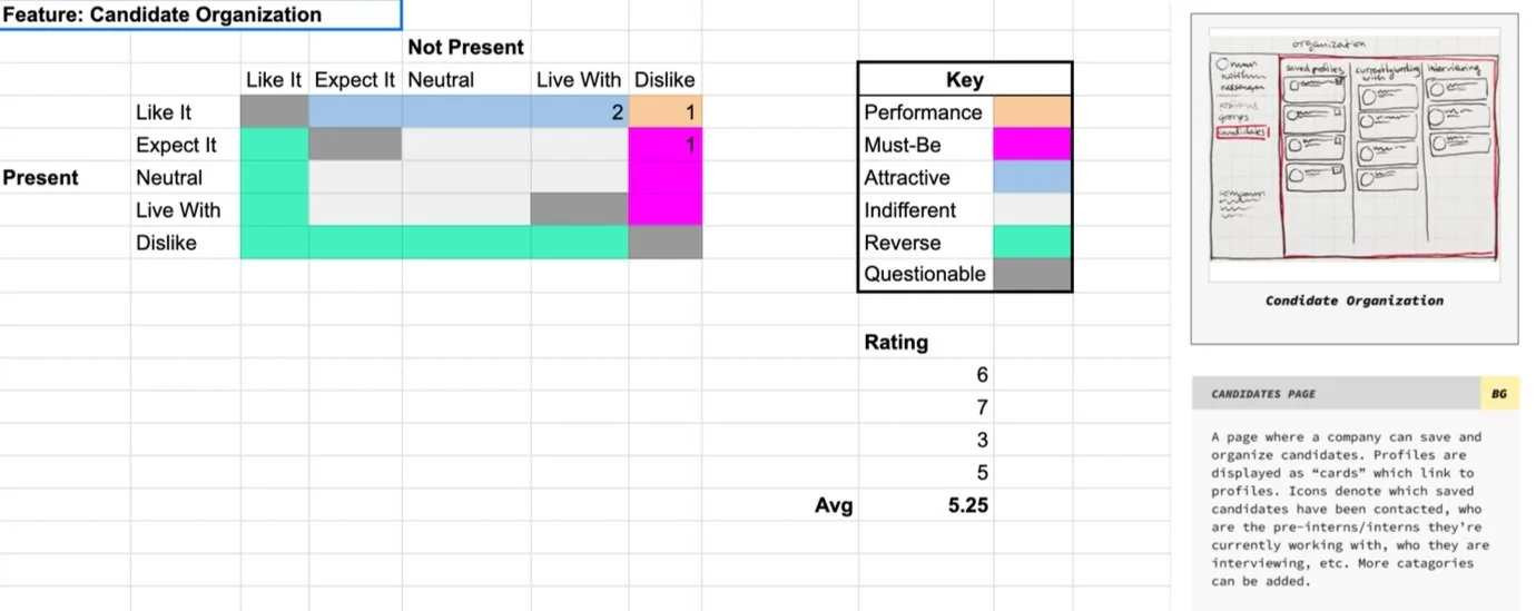 Wanting to stay within budget and the time constraints of the project, our team selected 10 of the 90 concepts and presented them to 10 current hiring managers in a survey format to aid our analysis of their feedback. They rated the features based on functionality, satisfaction, and importance. Taking their answers into account, our team synthesized the findings and implemented them in a KANO analysis method, in which we prioritized the features deemed quintessential to the website functionality, based on the data.