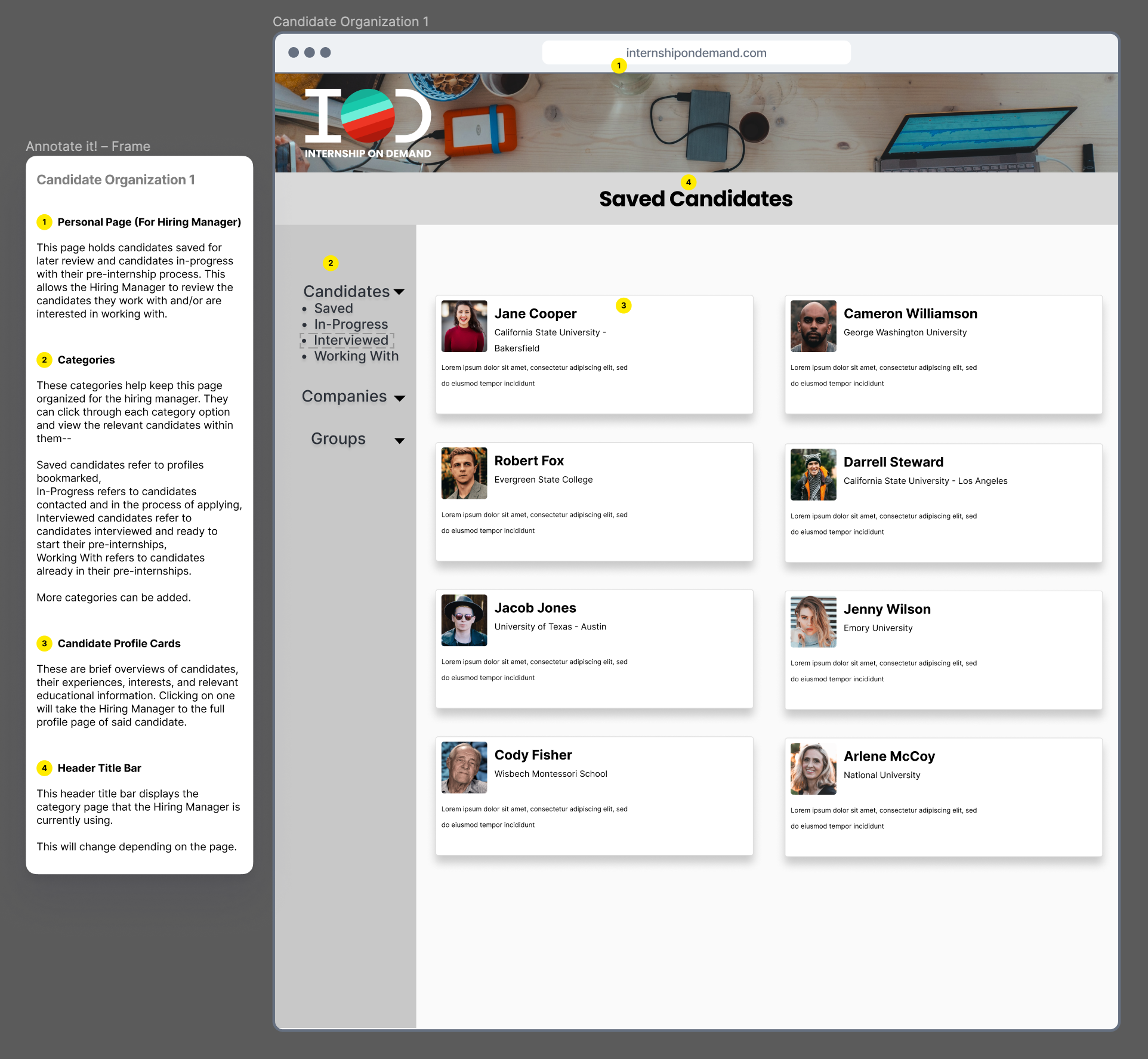 Our design team conducted research and analyses to finalize features that users found important, and prioritized key features based on scope and time constraints. As a team, we created recommendation documents— prototypes, wireframes, and/or slideshow reports, documenting how the proposed features would work within the website. These documents were then sent to the client, Internship on Demand and their development team, for feedback and implementation.