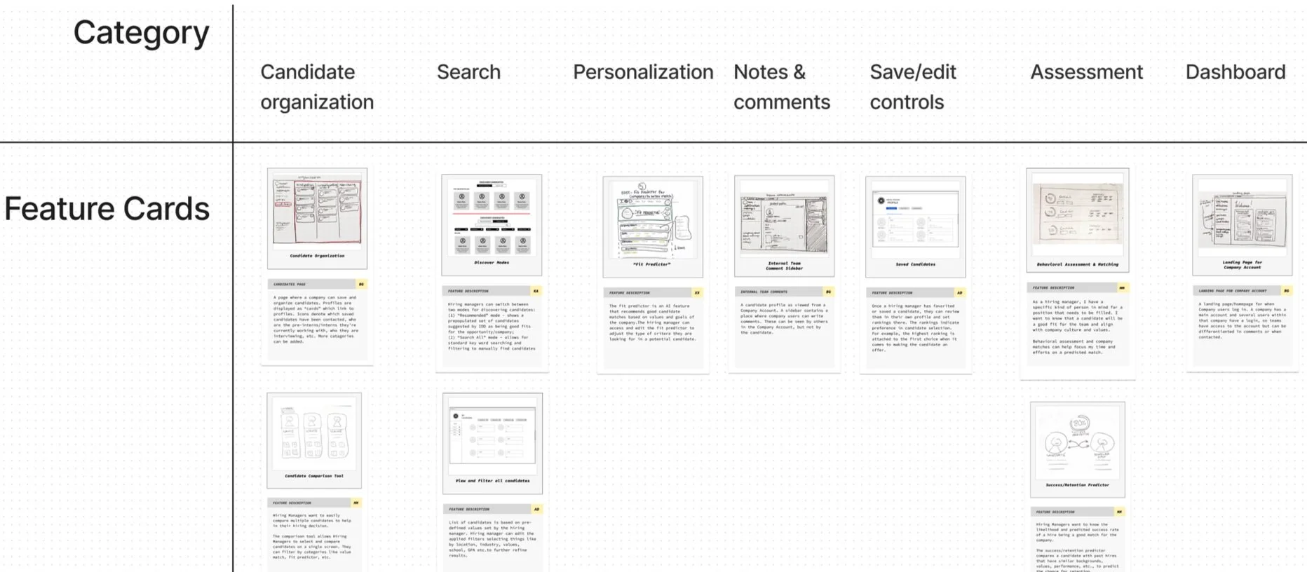 These are Figma boards containing our feature concept cards, organized into similar themes. The IOD developer helped us scope out time required and budget for each concept, further aiding us designers in prioritizing features based on those constraints.