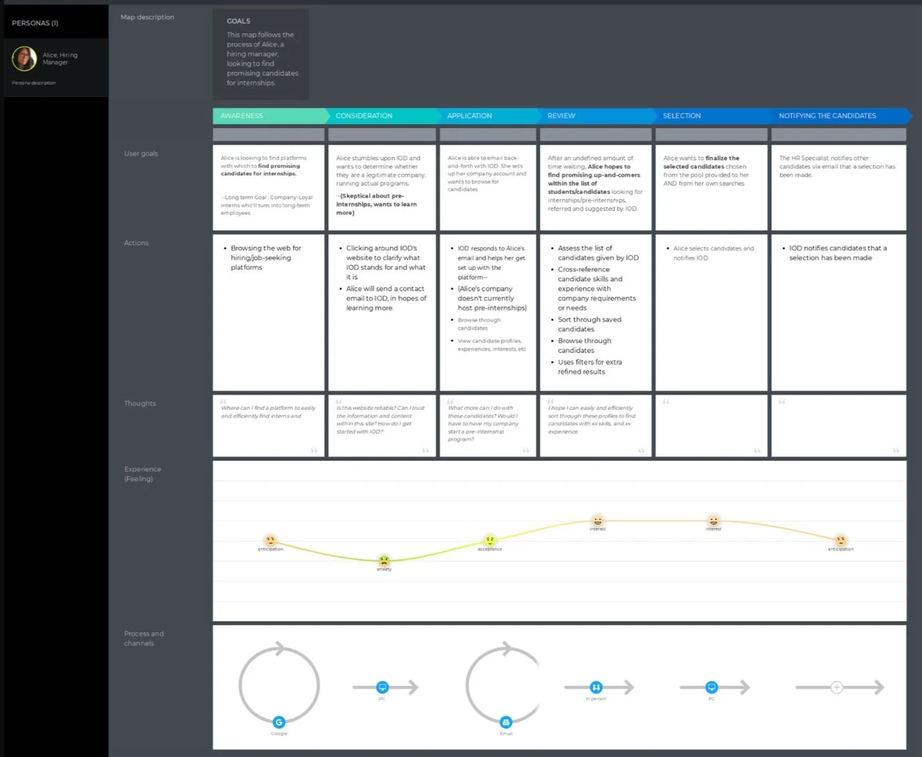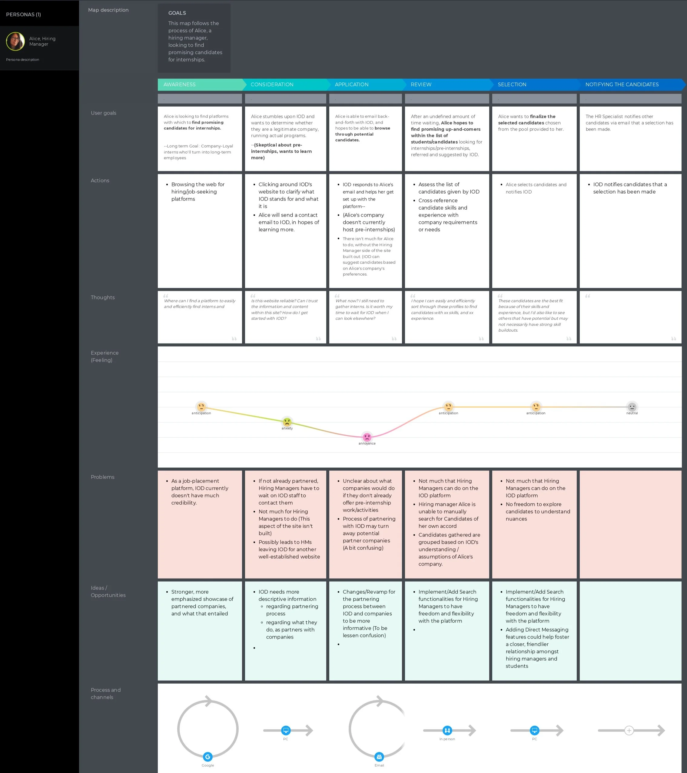 This first User Journey Map follows the persona Alice, in her interactions with the current existing iteration of Internship on Demand.