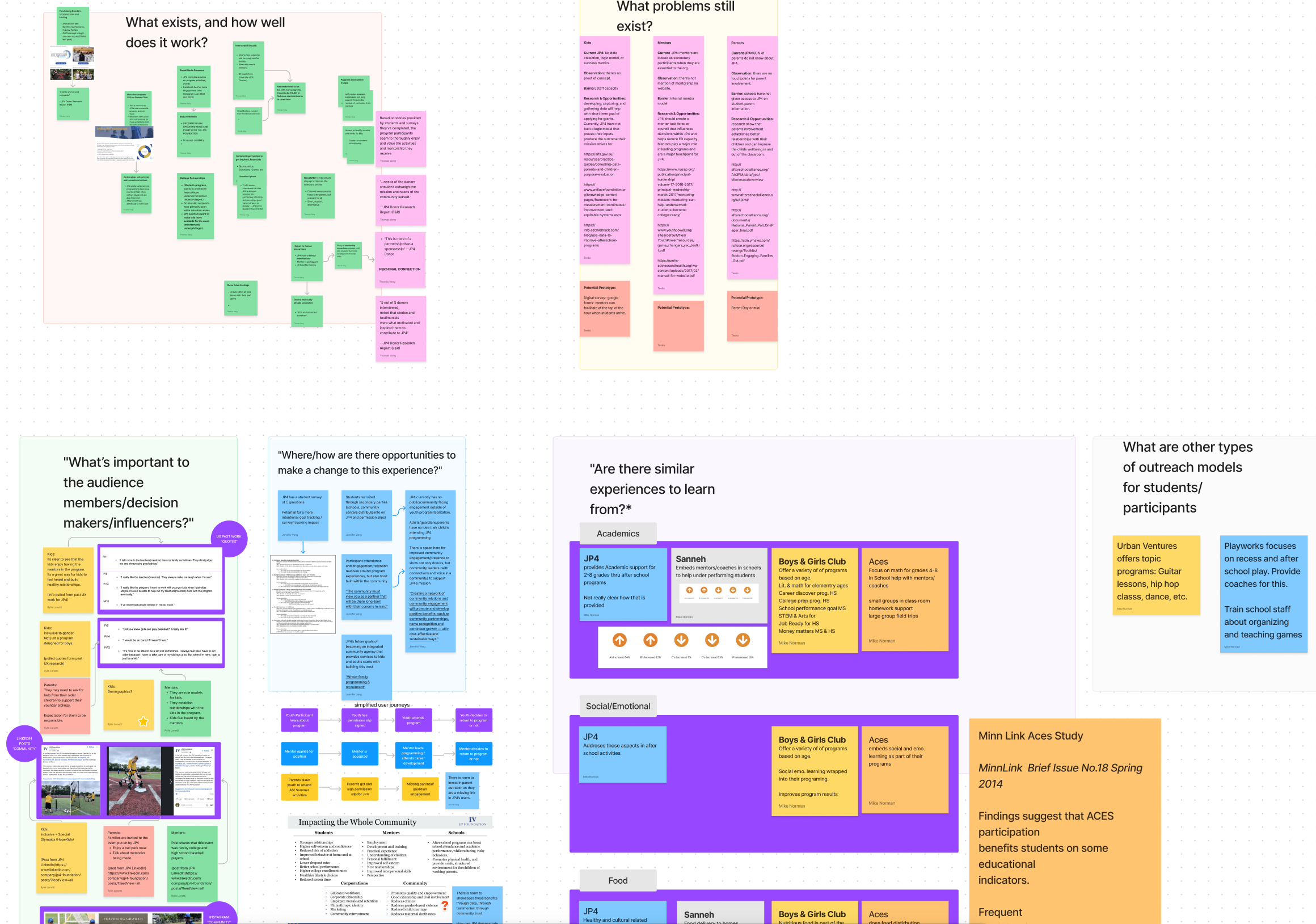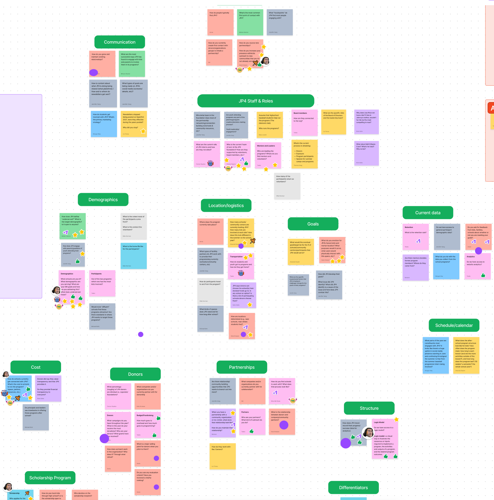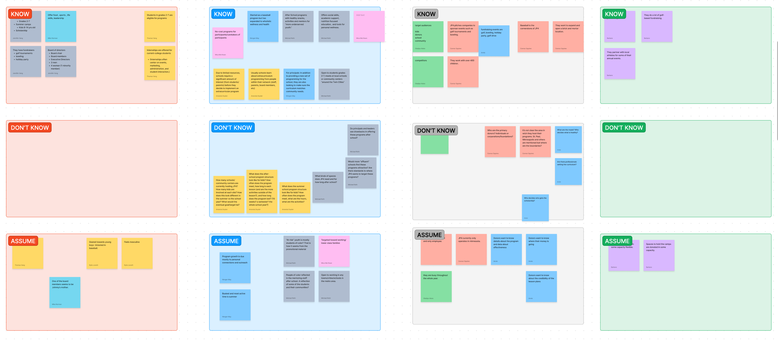 We grouped similar thoughts into questions to be asked in a STAKEHOLDER INTERVIEW with the Executive Director, in which he introduced us to the organization’s guiding philosophies, goals, and passions, and how the programs and activities offered by JP4 were executed.