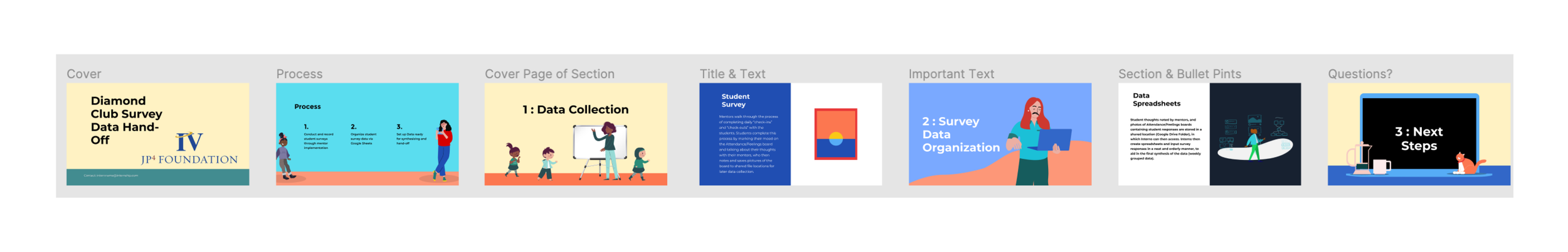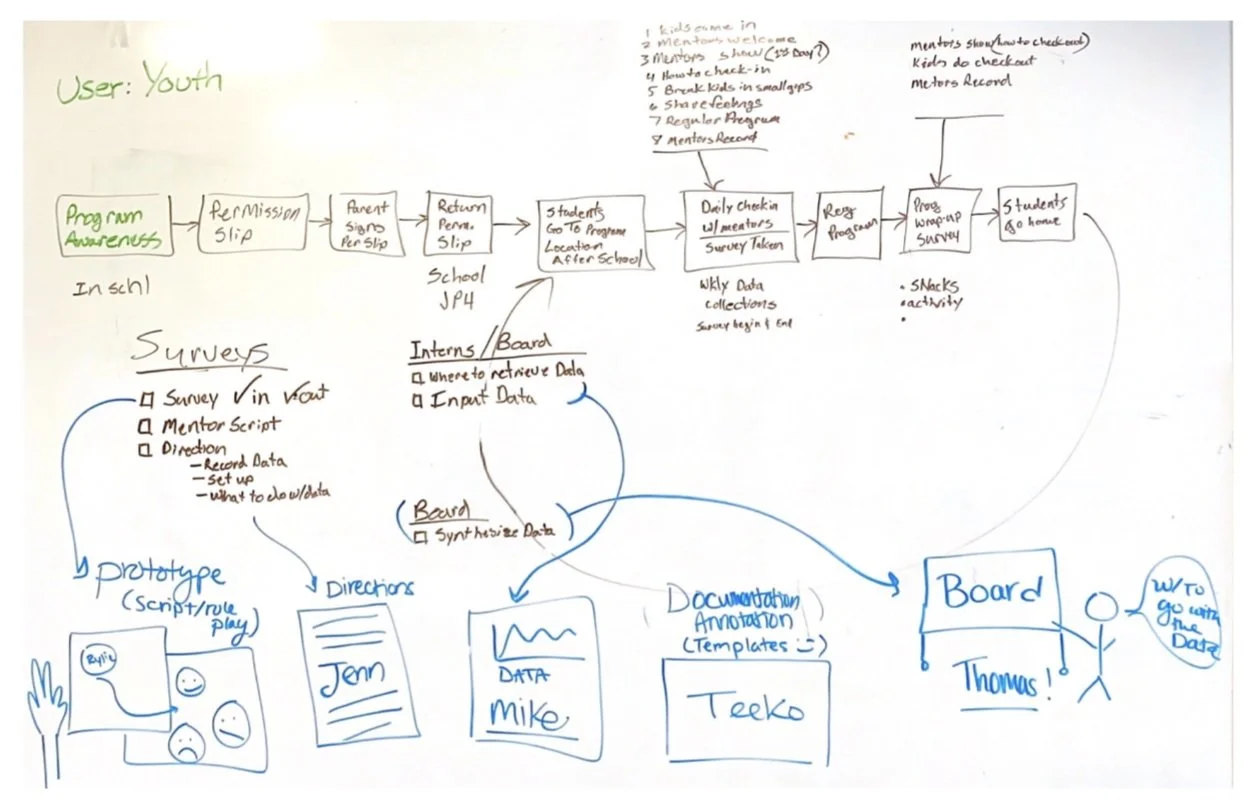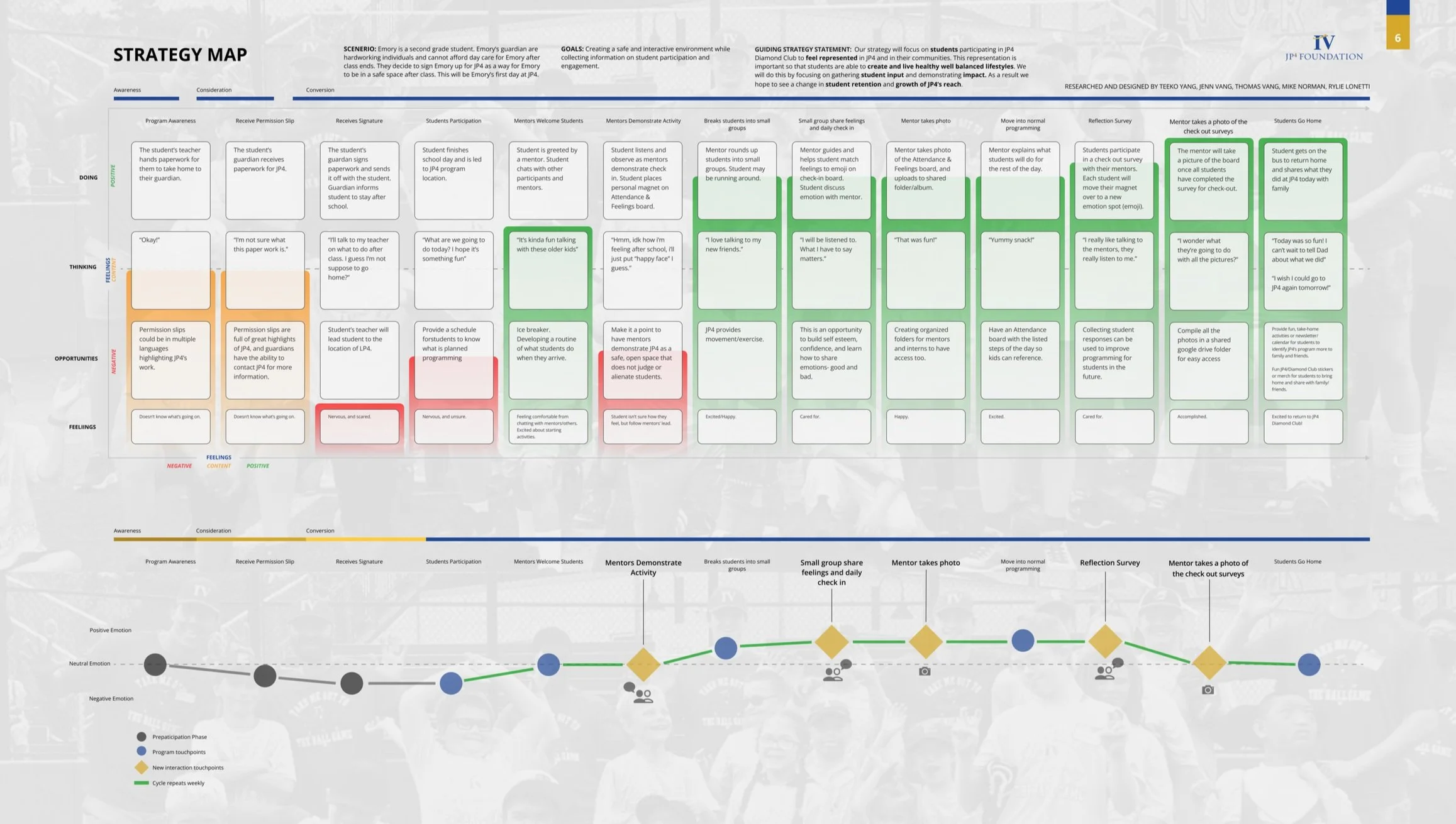 Our design team created a STRATEGY PROPOSAL that would be easily integrated into the EXISTING processes that JP4 possesses. This included a PROTOTYPE PACKAGE containing each team member’s touchpoint prototypes, guide/resource lists, and slideshow reports, documenting how the proposed strategy would affect the existing process and growth for future programming. Our proposal was the implementation of an improved survey method of data collection, increased implementation of the current team members (Mentors, Interns, and Board Members), and the implementation of data synthesis to visualize the student data in a way that would help the JP4 Foundation to appeal to potential sponsors/donors in the future.