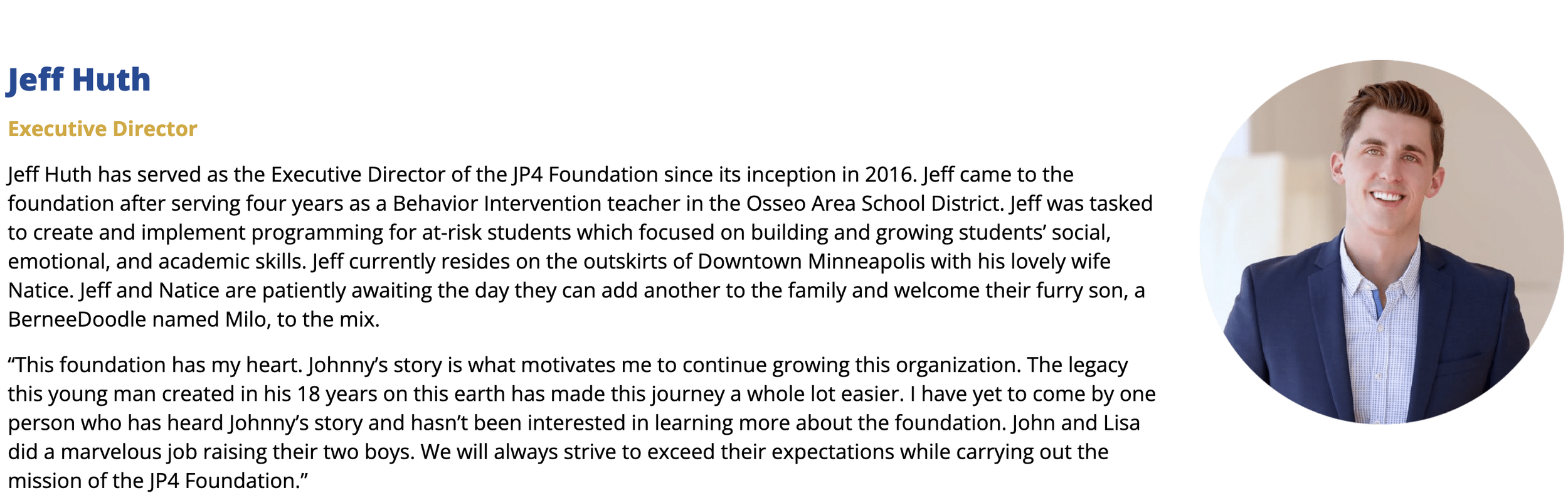 Established in 2016 in memory of John “Johnny” Price IV, the mission of the JP4 Non-Profit Foundation is to enrich the lives of youth in underserved communities through healthy activity, healthy meals and healthy relationships.